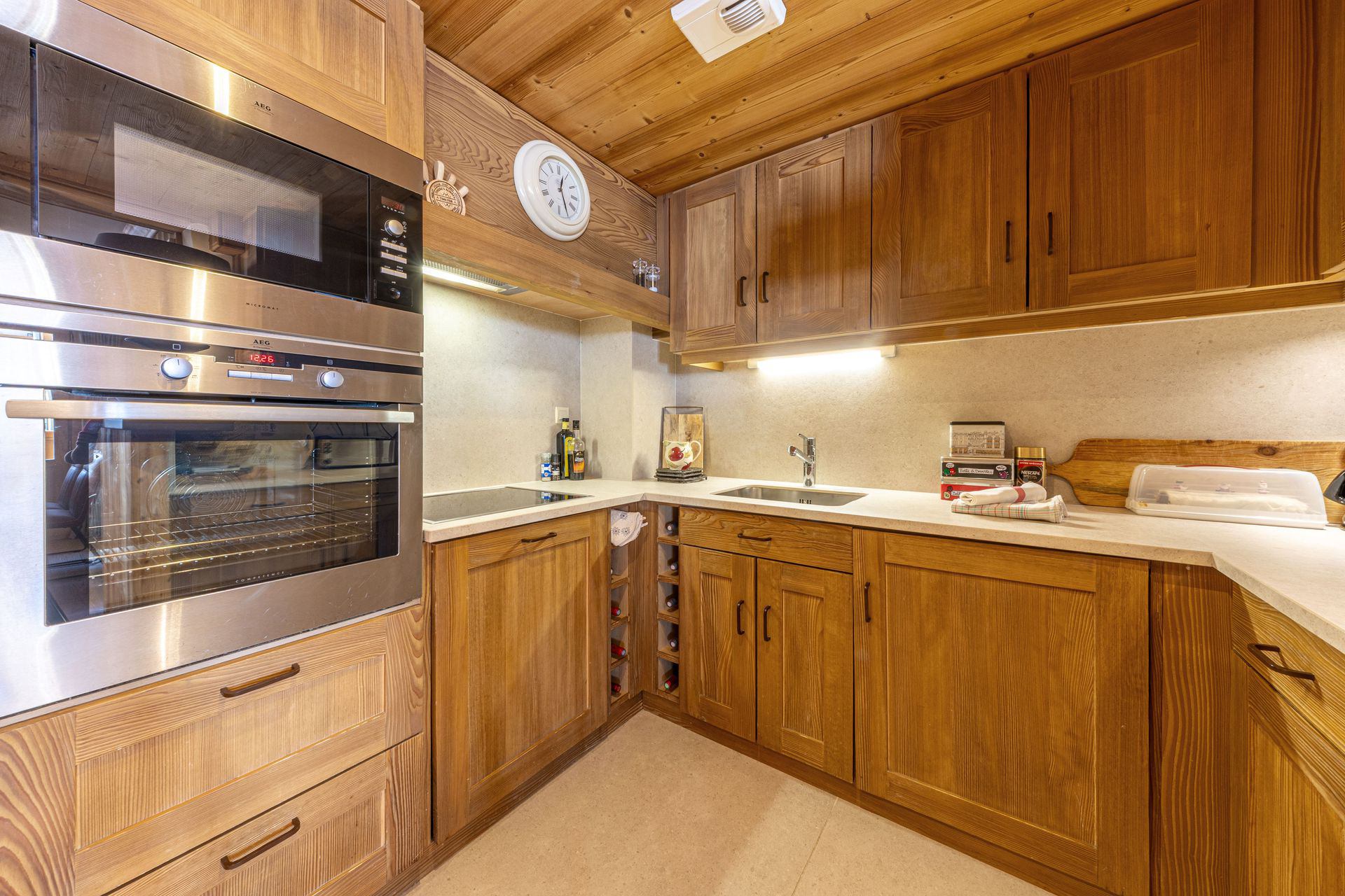 Cuisine Américaine équipée avec four, lave-vaisselle, micro-onde, lave-linge/sèche-linge, grand réfrégirateur et congélateur, plaques vitrocéramiques et hotte aspirante.