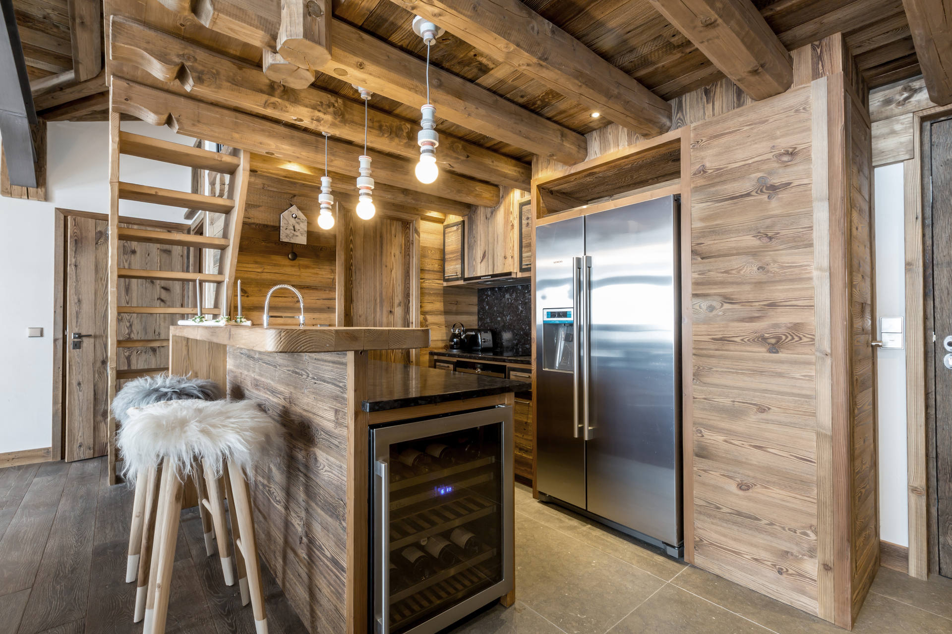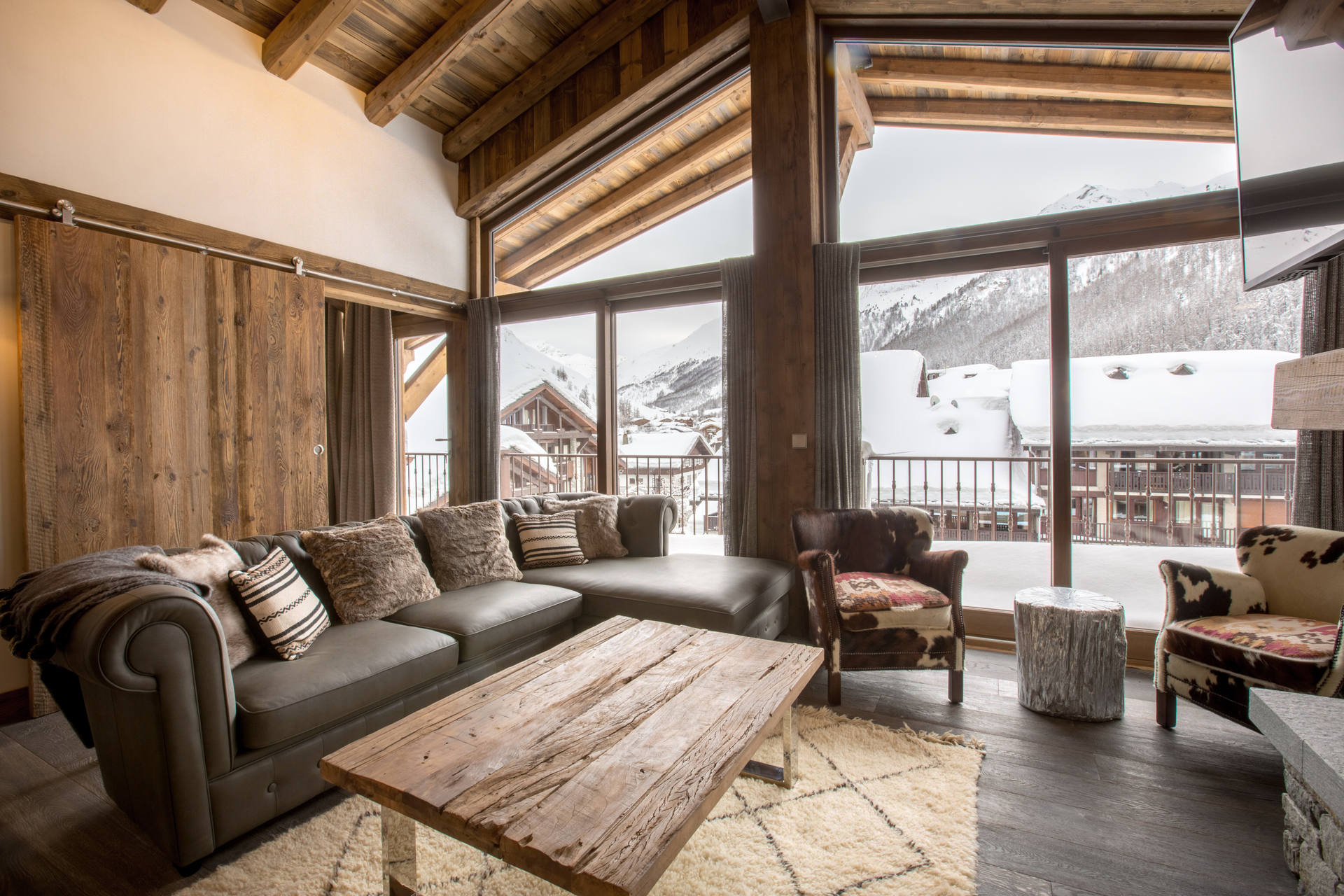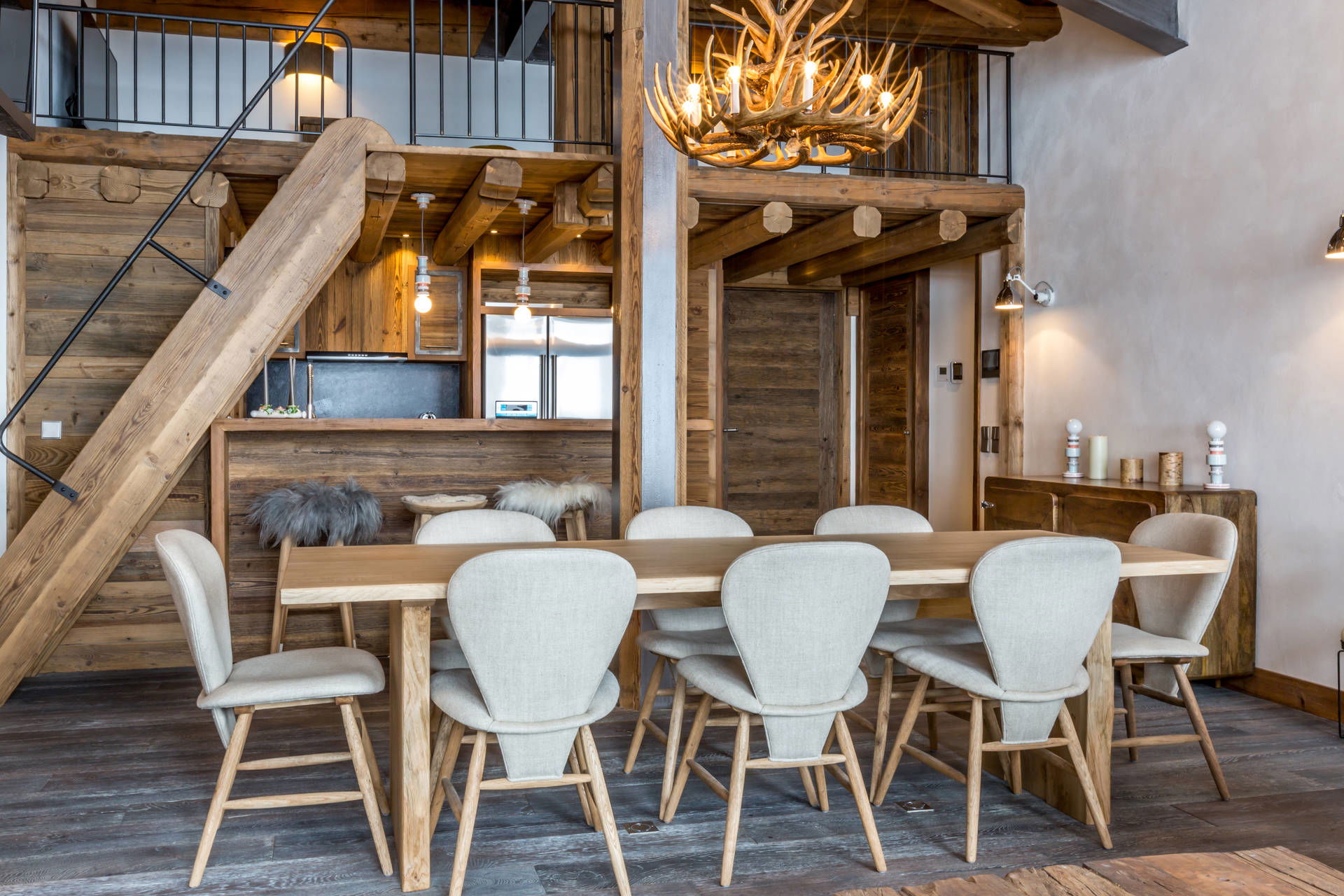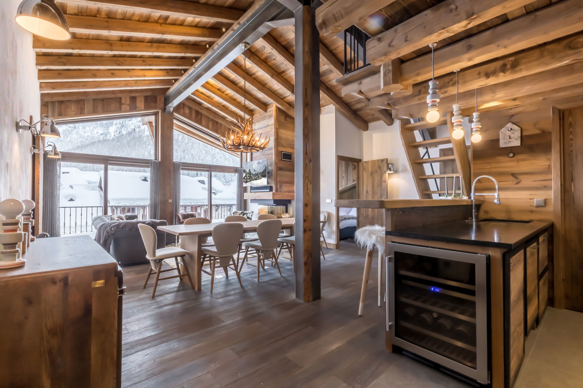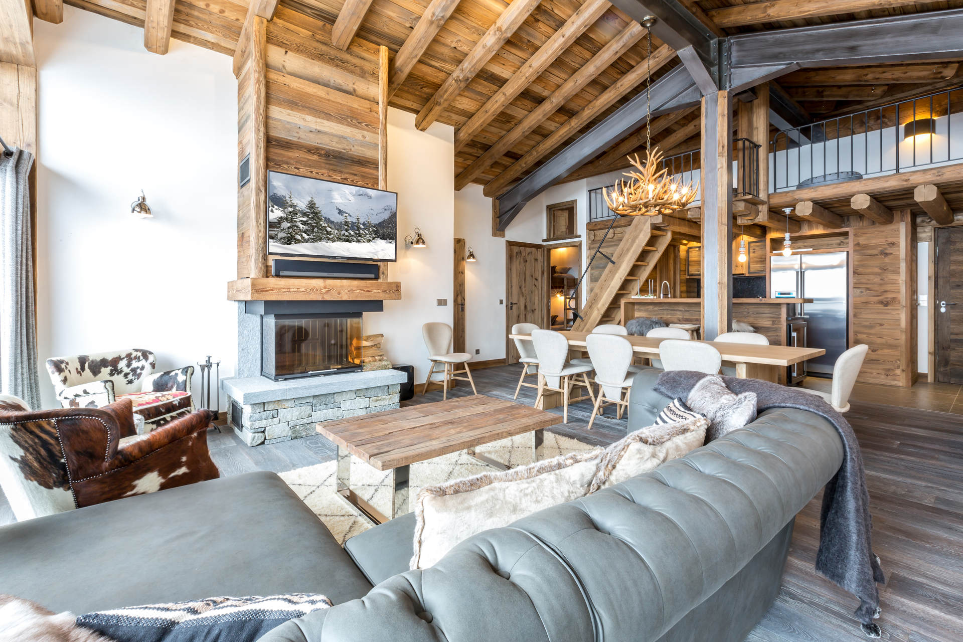 Intérieur de caractère alliant décoration contemporaine et architecture savoyarde authentique et chaleureuse faite de bois et pierre.