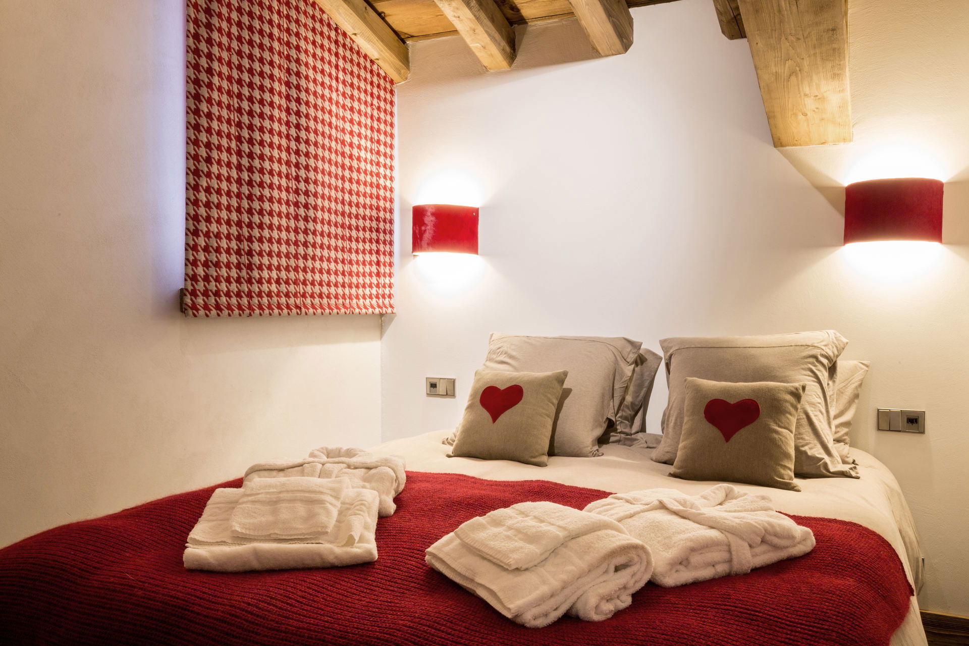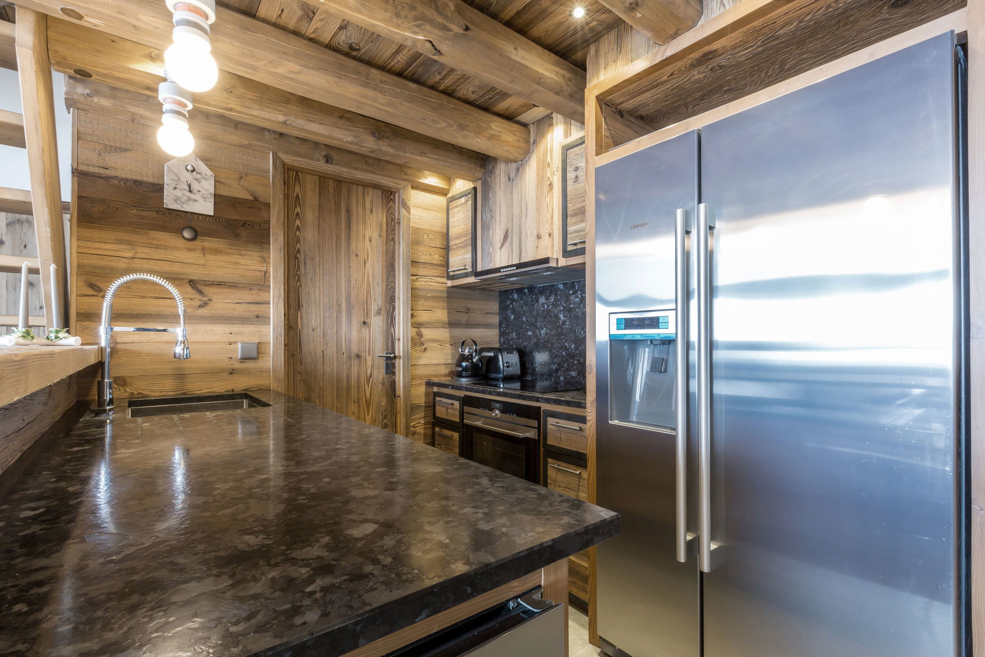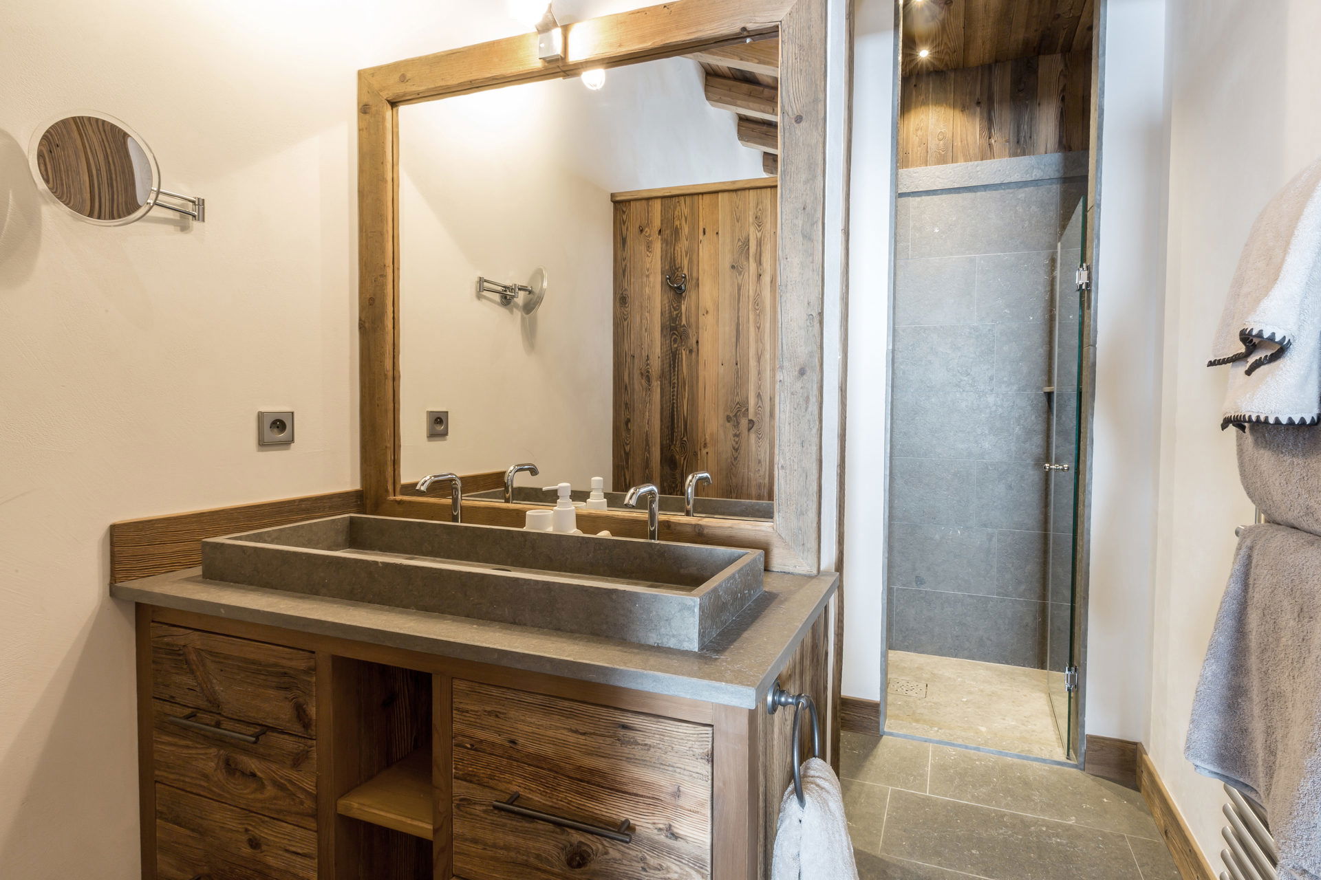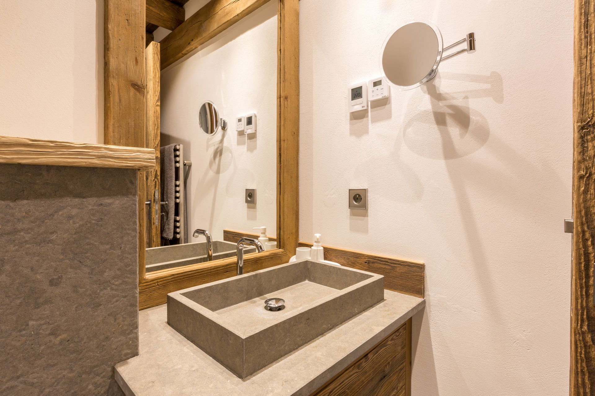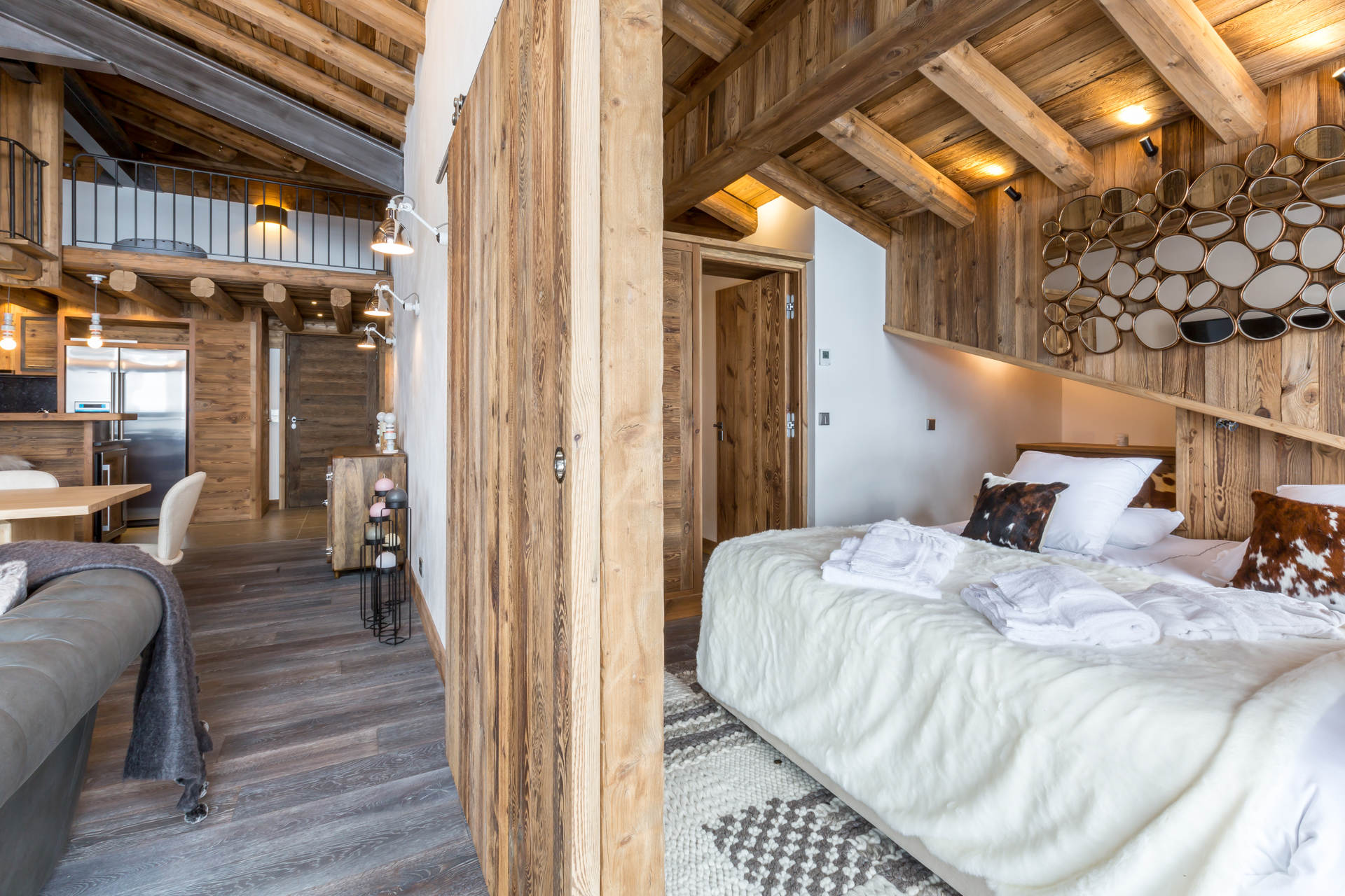 Intérieur de caractère alliant décoration contemporaine et architecture savoyarde authentique et chaleureuse faite de bois et pierre.