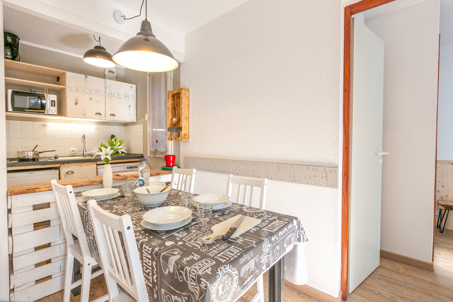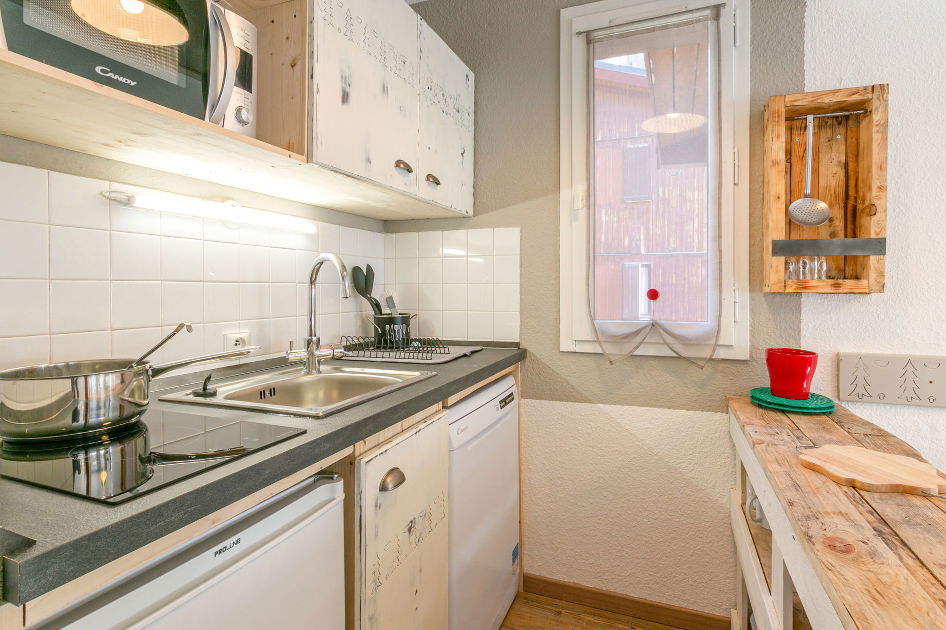 Equipée d'un four micro-ondes avec grill, lave-vaisselle, plaque vitrocéramique, réfrigérateur avec congélateur