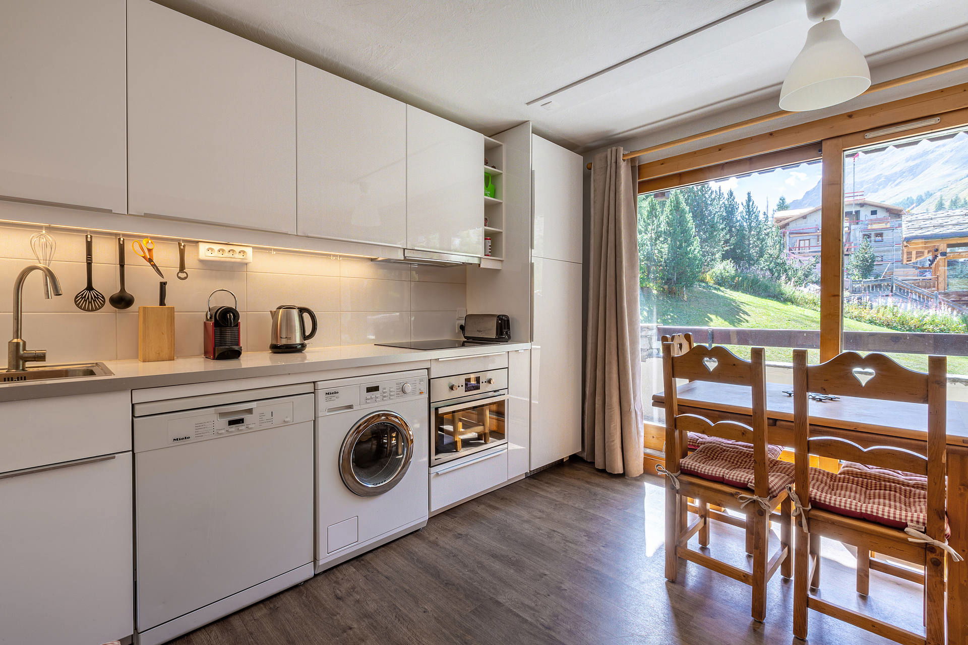 Equipée d'un combiné micro-onde multi fonctions, plaques vitrocéramiques et lave-vaisselle, grand réfrigérateur, hotte aspirante. Petit électroménager complet.