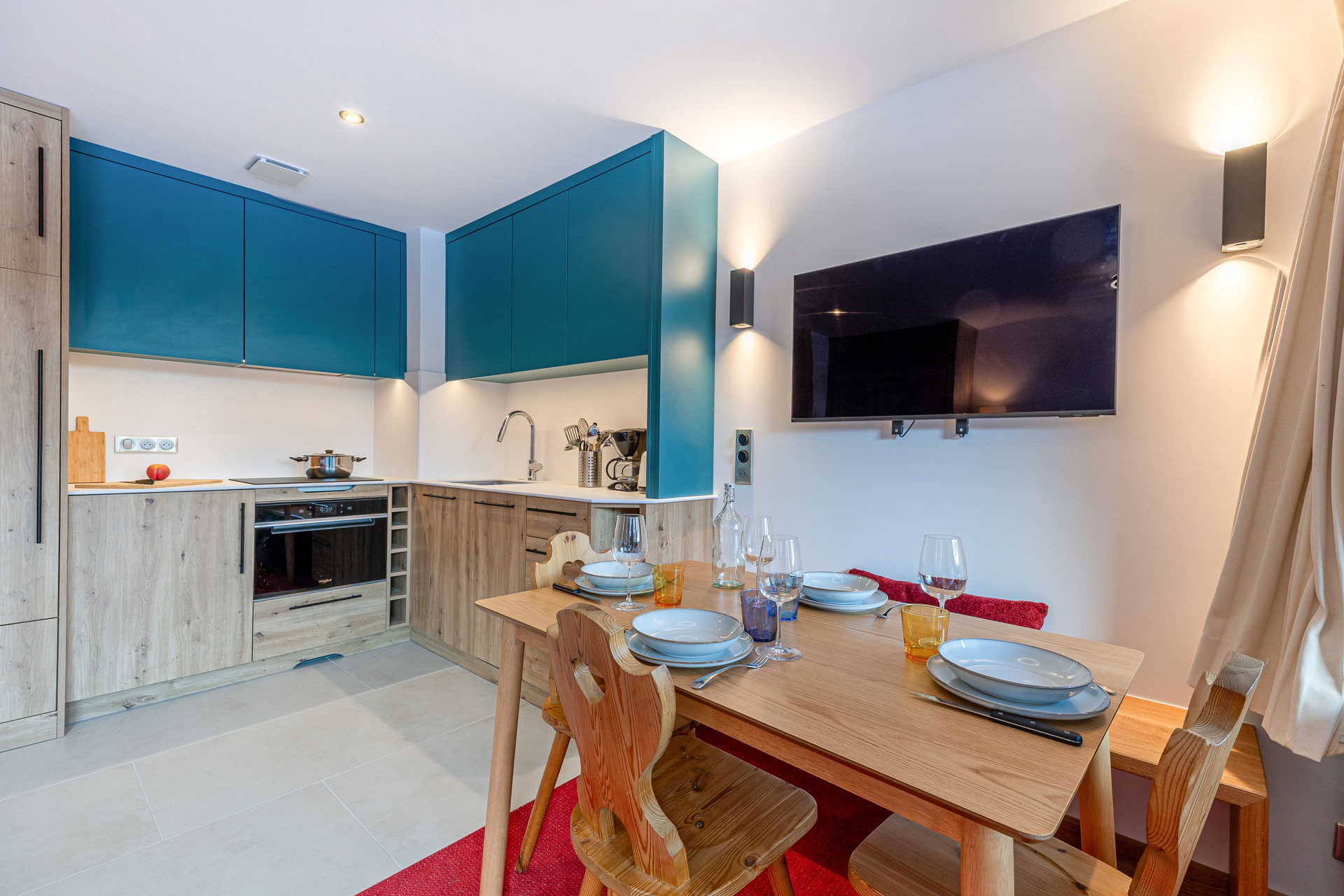 Equipée d'un micro-ondes avec grill, lave-vaisselle, réfrigérateur avec freezer, plaque induction, hotte aspirante et lave linge séchant