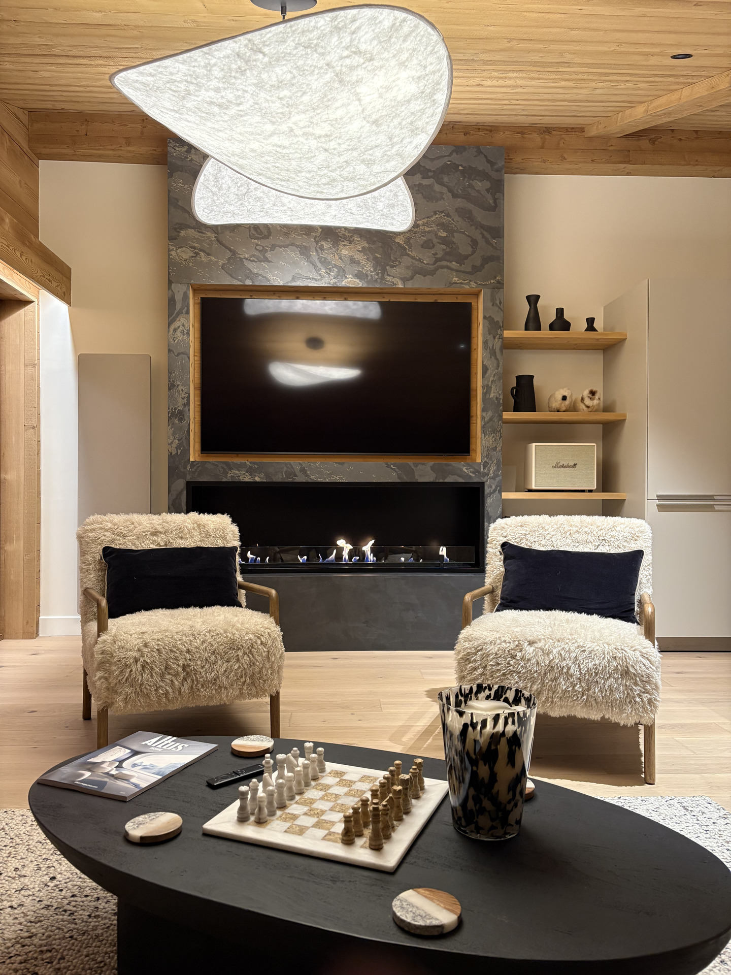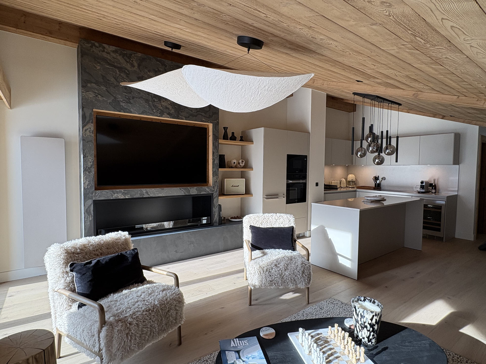 Grand salon avec cheminée éthanol, télévision et belle hauteur sous plafond