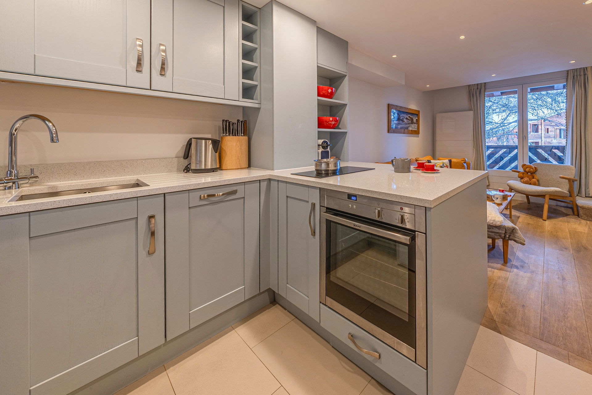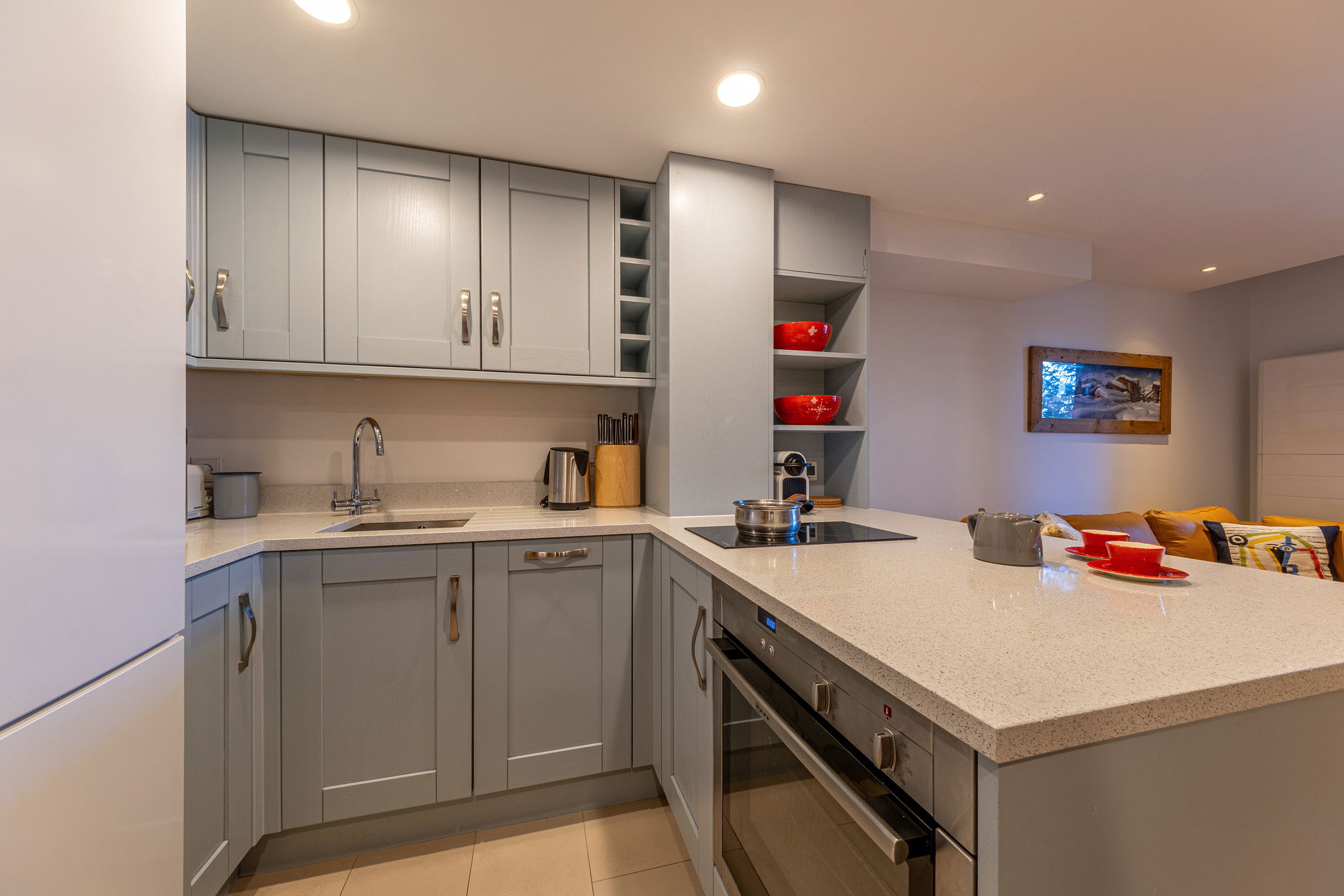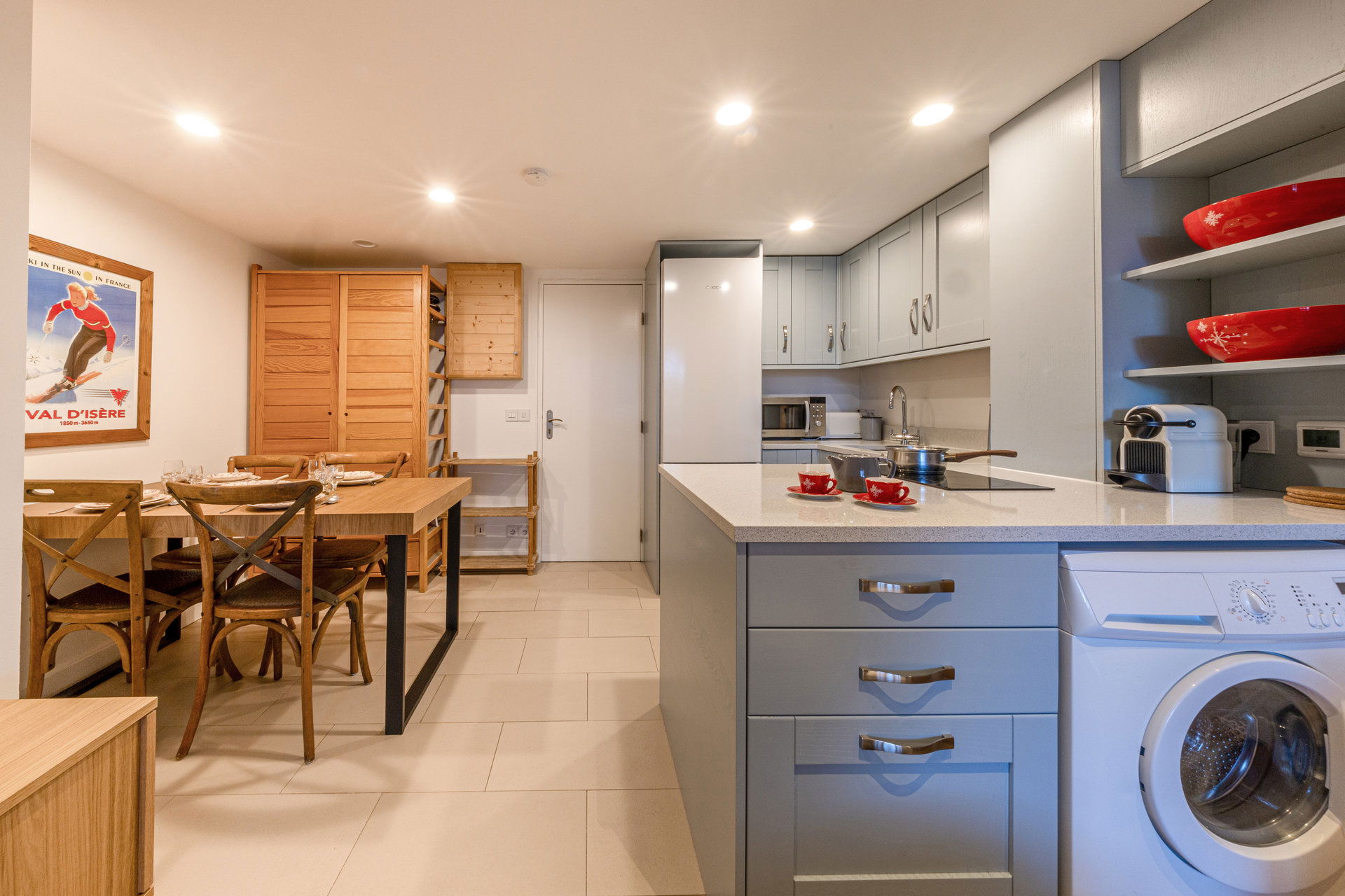 Equipée d'un lave-vaisselle, four, micro-ondes, plaque vitrocéramique, grand réfrigérateur avec congélateur, lave-linge